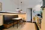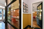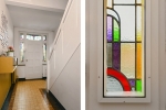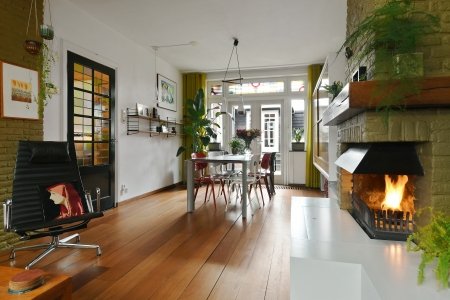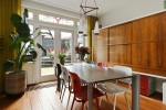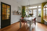 De glas-in-loodramen filteren het daglicht op subtiele wijze en geven de ruimte een zachte sfeer. De verbinding met de tuin via de openslaande deuren maakt het geheel compleet: binnen en buiten lopen hier op natuurlijke wijze in elkaar over. Hier is plek voor diners met vrienden, een glas wijn dat langer blijft staan dan gepland en gesprekken die moeiteloos doorlopen tot laat.