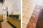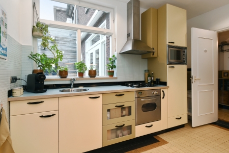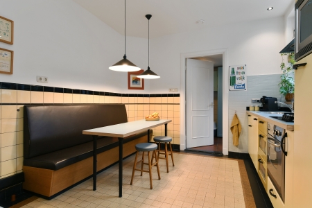 De keuken ademt een uitgesproken jaren ’70 karakter, op een manier die vandaag weer helemaal eigentijds aanvoelt. De zachte kleurstellingen, originele tegels en strakke belijning geven de ruimte een warme, herkenbare sfeer waarin koken vanzelf een dagelijks plezier wordt. Dankzij het raam is er prettig zicht op de patiotuin, waardoor binnen en buiten hier mooi met elkaar verbonden zijn. De keuken is voorzien van 4-pit gaskookplaat (2022), koelkast (2025), oven, magnetron en afzuigkap.