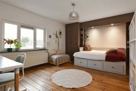 Op de eerste verdieping zijn twee slaapkamers, een kleedkamer/kinderkamer en een badkamer gelegen. De slaapkamers zijn licht, ruim en sfeervol, met elk een eigen karakter. Grote ramen zorgen voor een prettige daglichttoetreding. Leuk detail is de hippe bedstee op de tienerkamer.