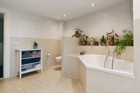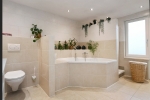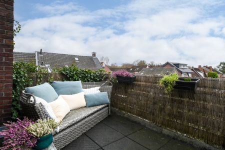 De badkamer is ruim opgezet met een rustige, tijdloze afwerking. Het royale ligbad vormt het middelpunt van de ruimte en nodigt uit tot ontspannen momenten na een lange dag. De lichte tegels zorgen voor een frisse uitstraling. Met een dubbele wastafel, veel bergruimte en voldoende bewegingsvrijheid is deze badkamer niet alleen mooi, maar ook praktisch in dagelijks gebruik. Het daglicht en de rustige kleurstelling maken het geheel tot een aangename plek waar comfort en functionaliteit samenkomen. Direct grenzend aan de badkamer bevindt zich een beschut dakterras, een verrassende extra buitenruimte die deze verdieping net dat beetje meer geeft. Een heerlijke plek om de dag rustig te beginnen of juist ontspannen af te sluiten.