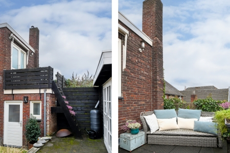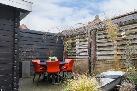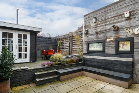 Het tuinhuis vormt een waardevolle aanvulling en is praktisch voor opslag. De eigen achterom maakt de tuin bovendien prettig bereikbaar en voegt een extra laag gemak toe aan het dagelijks gebruik.