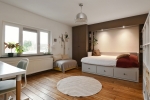 Eén van de slaapkamers verrast met een authentieke jaren ’70 uitstraling, compleet met uitgesproken behang en warme tinten, een speels en karaktervol accent dat liefhebbers direct zal aanspreken. Deze kamer is ingericht als kleedkamer maar is ook ideaal als werk-, logeer- of babykamer.