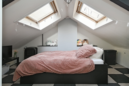Middels een vaste trap is de ruime tweede verdieping bereikbaar. Op deze verdieping bevindt zich een volwaardige vierde slaapkamer, gelegen onder het schuine dak en voorzien van dakramen die zorgen voor een prettige daglichttoetreding. De zichtbare kapconstructie geeft de ruimte extra karakter.
