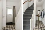 Gezellige entree met garderobe, meterkast en geheel betegelde toiletruimte (2007) voorzien van closet en fontein. De vloer in de hal is fraai betegeld en karakteristieke paneeldeuren welke toegang bieden tot de ruime woonkamer. De vloer in de woonkamer is afgewerkt met laminaat en de wanden en het plafond zijn strak gestukt, voorzien van inbouwspots en gedeeltelijk voorzien van trendy behang.