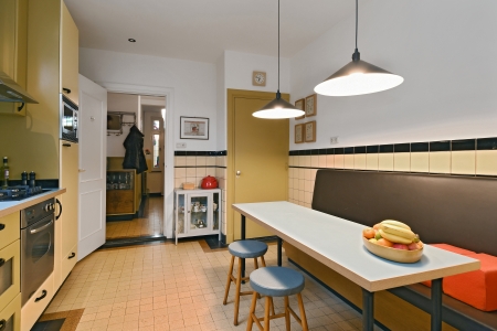De keuken ademt een uitgesproken jaren ’70 karakter, op een manier die vandaag weer helemaal eigentijds aanvoelt. De zachte kleurstellingen, originele tegels en strakke belijning geven de ruimte een warme, herkenbare sfeer waarin koken vanzelf een dagelijks plezier wordt. Dankzij het raam is er prettig zicht op de patiotuin, waardoor binnen en buiten hier mooi met elkaar verbonden zijn. De keuken is voorzien van 4-pit gaskookplaat (2022), koelkast (2025), oven, magnetron en afzuigkap.