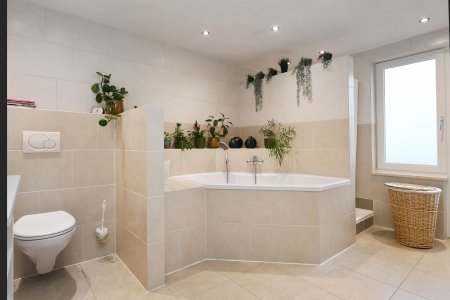 De badkamer is ruim opgezet met een rustige, tijdloze afwerking. Het royale ligbad vormt het middelpunt van de ruimte en nodigt uit tot ontspannen momenten na een lange dag. De lichte tegels zorgen voor een frisse uitstraling. Met een dubbele wastafel, veel bergruimte en voldoende bewegingsvrijheid is deze badkamer niet alleen mooi, maar ook praktisch in dagelijks gebruik. Het daglicht en de rustige kleurstelling maken het geheel tot een aangename plek waar comfort en functionaliteit samenkomen. Direct grenzend aan de badkamer bevindt zich een beschut dakterras, een verrassende extra buitenruimte die deze verdieping net dat beetje meer geeft. Een heerlijke plek om de dag rustig te beginnen of juist ontspannen af te sluiten.