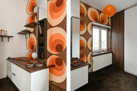 Eén van de slaapkamers verrast met een authentieke jaren ’70 uitstraling, compleet met uitgesproken behang en warme tinten, een speels en karaktervol accent dat liefhebbers direct zal aanspreken. Deze kamer is ingericht als kleedkamer maar is ook ideaal als werk-, logeer- of babykamer.