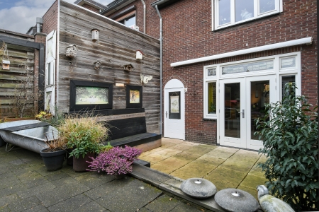 Middels de authentieke voordeur die rondom voorzien is van fraaie glas in lood ramen komt u in de ruime ontvangsthal. De vloer is afgewerkt met de originele jaren 30 keramische tegeltjes. Luxe betegelde toiletruimte voorzien van wandcloset en fontein. De woonkamer is ruim van opzet en heeft door de grote raampartijen veel lichtinval en biedt een fraai uitzicht over de knusse patiotuin.