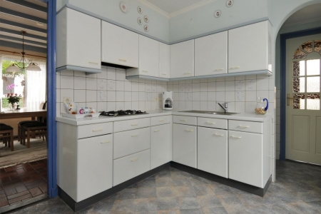 De woonkamer en serre zijn samen ca. 45 m² groot. Ruime dichte keuken (13 m²) met lichte keukenopstelling en complete (inbouw) apparatuur. Doorgang naar toiletruimte met staand closet en fontein en tweede badkamer voorzien van ligbad en dubbele wastafel in een wastafelmeubel en designradiator. De toiletruimte en badkamer zijn eenvoudig doch keurig afgewerkt met witte wandtegels en wit sanitair. Doorgang naar royale hobbyruimte met vaste trap naar de zolder, tezamen ca, 140 m². In deze hobbyruimte is een kleine keukenunit en de opstelling van was- en droogapparatuur aanwezig. Doorgang naar de garage. De garage is voorzien van een elektrisch bedienbare sectionaalpoort en heeft een inrijhoogte van ca. 2.30. Naast de garage bevindt zich nog een extra bergruimte / hobbyruimte.